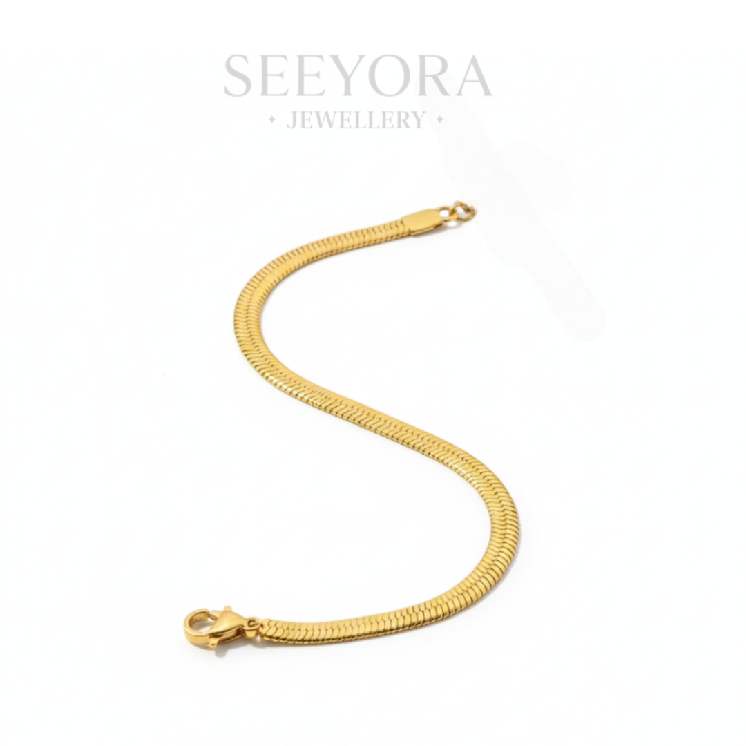 A sleek embodiment of understated luxury, the Golden Weave bracelet features a fluid snake-chain design that wraps the wrist with effortless sophistication. Its polished gold tone catches light with every movement, offering a refined balance between minimalism and elegance. Perfect for layering or wearing solo as a statement of quiet confidence.
