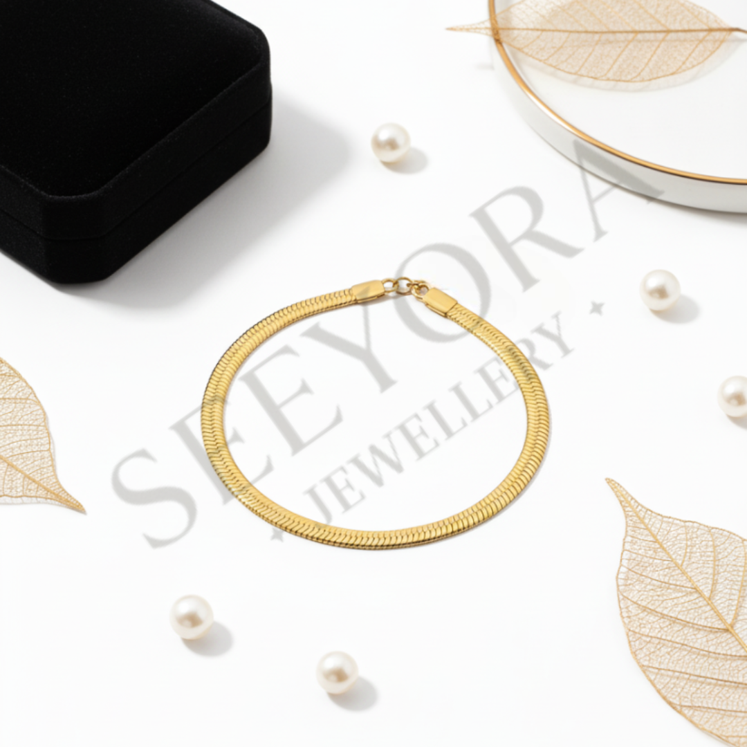 Fluid Snake Chain: The signature design is a densely woven snake chain that provides a silky, flexible drape against the skin, ensuring maximum comfort and a luxurious feel.